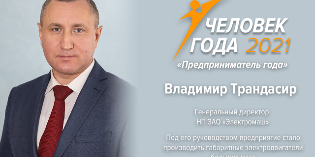 Гендиректор завода «Электромаш» Владимир Трандасир стал «Предпринимателем года» Под его руководством предприятие стало производить габаритные электродвигатели больших масс 26 Фев., 2022, 21:11 Общество Человек года