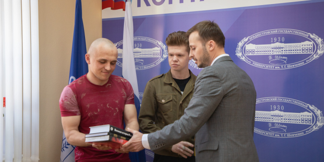 В Россотрудничестве вручили книги победителям «Диктанта Победы» Приднестровские студенты Александр Ганзий и Ян Рылов получили комплекты книг по истории России 10 Май, 2022, 17:14 Общество Россотрудничество Диктант Победы