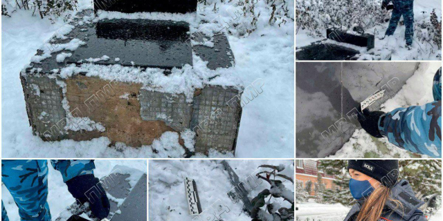 Верхняя часть мемориала разбита на множество фрагментов. Разрушена и передняя часть основания памятника