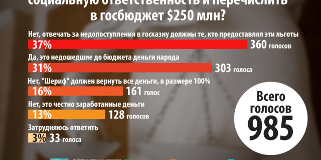 Большая часть участников опроса считает, что за предоставление необоснованных льгот ООО «Шериф» должно ответить бывшее руководство республики, примерно треть уверена, что компания обязана вернуть народу $250 млн