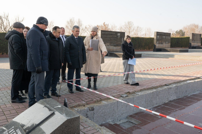 Президенту рассказали, что основные работы на Мемориале Славы практически завершены. Сейчас ведётся укладка гранитных плит у Вечного огня.