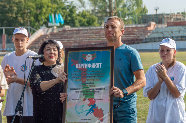 Тирасполь, 1 сентября. /Новости Приднестровья/. В честь 29-й годовщины образования ПМР Евгений Борщ преодолел ультрамарафон. На городском стадионе представитель Госслужбы по спорту ПМР вручил ему сертификат, который свидетельствует о преодолении дистанции 155 км за 24 часа. Спортсмен рассказал, что это его личный рекорд.