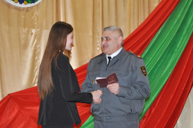 Начальник городского паспортного отделения подполковник Владимир Поя вручил паспорта юным рыбничанам и пожелал с честью и достоинством носить звание граждан Приднестровской Молдавской Республики.