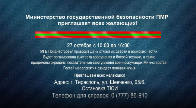 Тирасполь, 24 октября. /Новости Приднестровья/. 27 октября с 10:00 до 16:00 Министерство государственной безопасности ПМР проведет очередной День открытых дверей в одной из своих воинских частей по адресу: Тирасполь, ул. Шевченко, 95/6. К участию приглашаются все желающие.