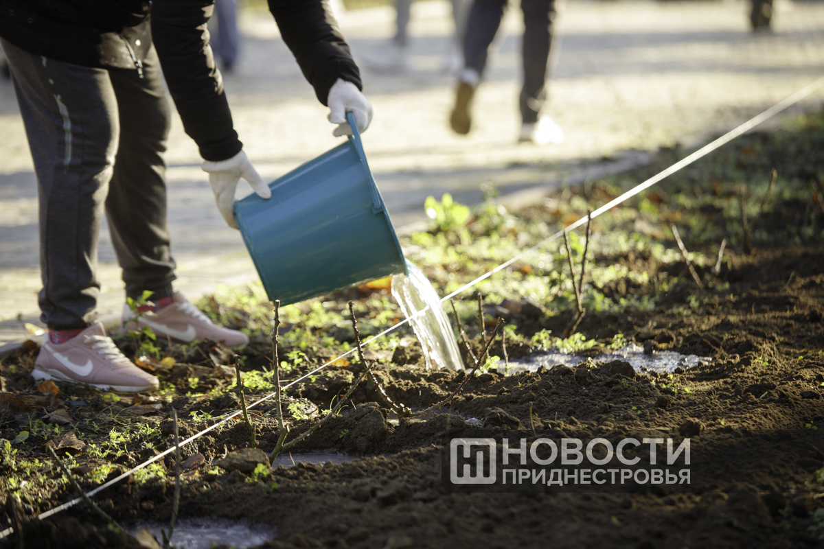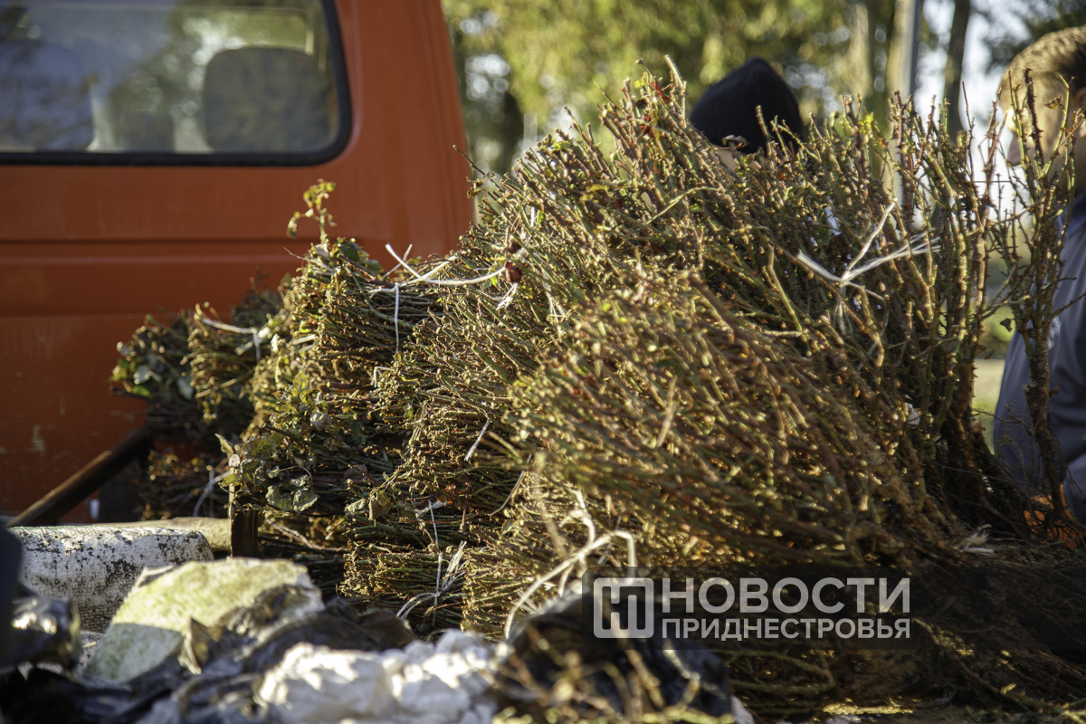 Перед посадкой представители слободзейской госадминистрации и горрайсовета остригли розы и сформировали кусты необходимой формы. После - принялись их сажать. Лунки для кустов ещё вчера подготовили курсанты Тираспольского юридического института. Ребята привели в порядок территорию плацдарма и клумбы.