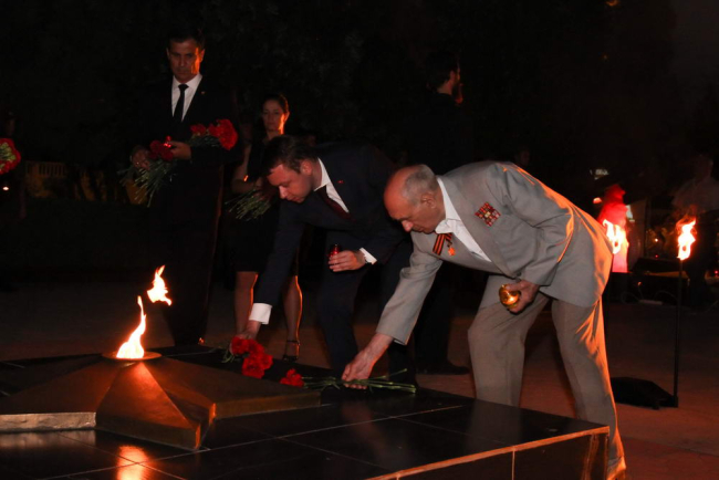 В память о героях-фронтовиках, остановивших коричневую чуму, к Вечному Огню легли живые цветы от официальных лиц, ветеранов Великой Отечественной войны и горожан.