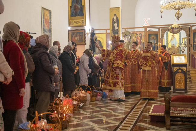 Продолжилась ночная пасхальная служба главным торжественным молебном в честь Светлого Христова Воскресения. Перед её окончанием был освящен пасхальный хлеб.