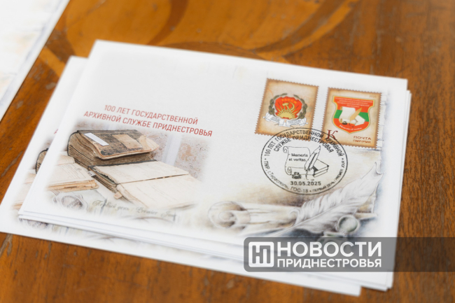 В начале мероприятия прошло торжественное спецгащение памятного конверта. Его посвятили 100-летию со дня образования государственной архивной службы Приднестровья. На конверте изображена марка с логотипом ГСУДА и фальшмарка с гербом МАССР – именно тогда служба зародилась.