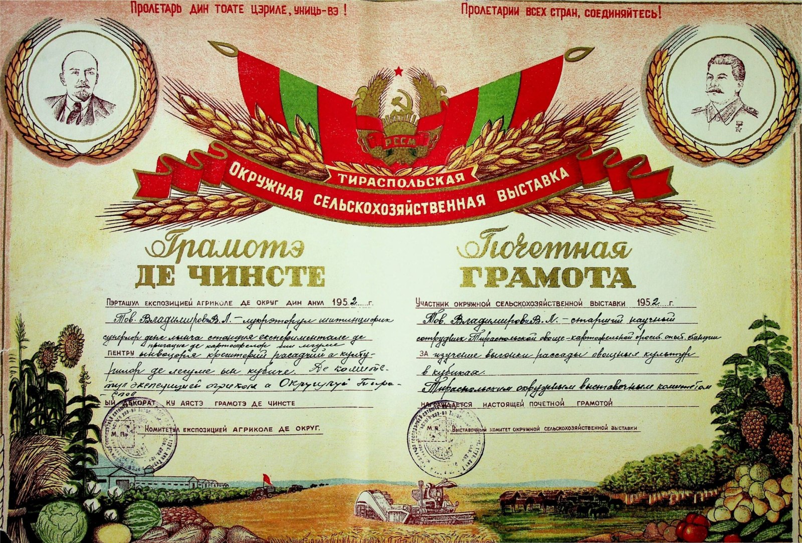 Это почётная грамота участника Тираспольской окружной сельскохозяйственной выставки 1952 года. Этой награды Валентина Владимирова (Ершова) была удостоена за изучение выгонки рассады овощных культур в кубиках. Грамота заверена печатью Управления сельского хозяйства Тираспольского совета депутатов трудящихся.