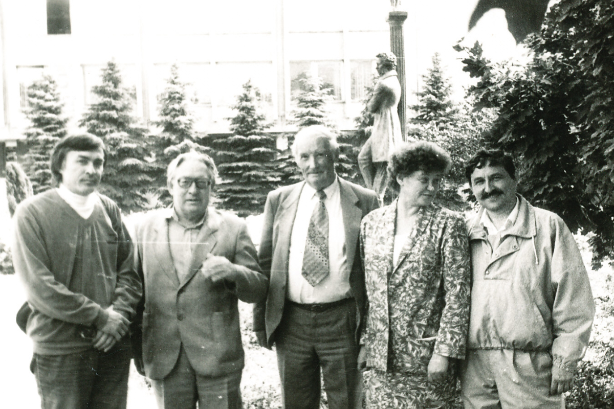 На фото слева направо: поэт Олег Максимов, критик В. Мильков (г. Москва), сын Н. С. Гумилёва О. Н. Выготский, праправнучка поэта А. С. Пушкина Юлия Пушкина, писатель В. Л. Полушин
