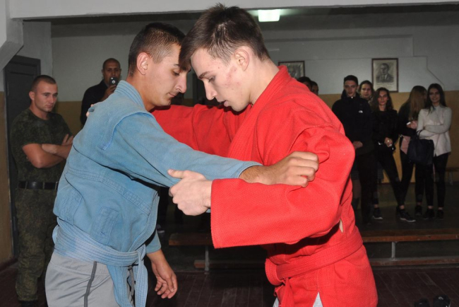 Во время экскурсии у курсантов проходили занятия по физической подготовке. Военнослужащие занимались борьбой самбо, отрабатывали броски, болевые и удушающие приемы. Присоединиться к курсантам пожелали некоторые из школьников. Учащиеся продемонстрировали свои навыки владения рядом приемов.