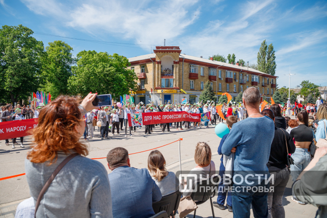 К участию пригласили представителей порядка 30 организаций как муниципальных, так и частных. Всего получилось около 2 тысяч человек. Шествие начали от ж/д вокзала, а как только колонны выходили на центральную площадь города, то каждое предприятие представляли зрителям. Говорили о профиле деятельности и достижениях, получился самый что ни на есть парад трудящихся.