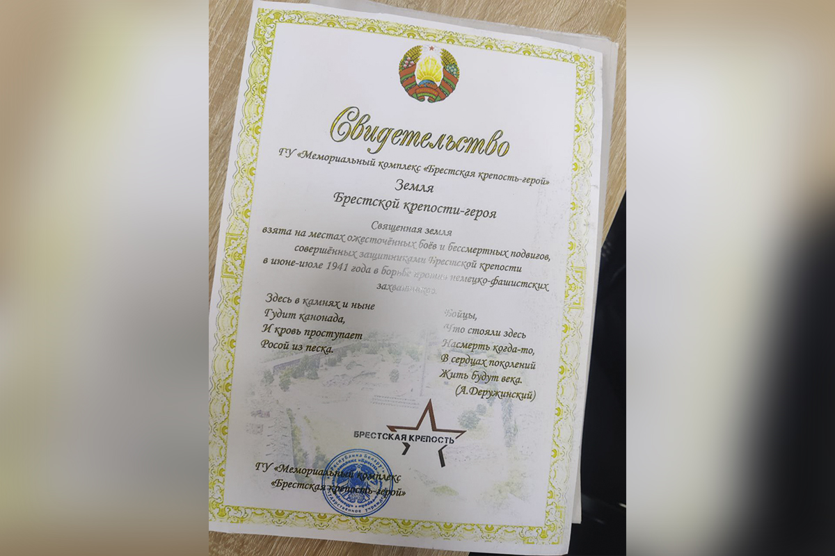«Это часть большой работы по патриотическому воспитанию молодёжи, которую мы ведём. Был подписан договор с Белорусским союзом офицеров, от организации передана земля, пропитанная кровью защитников. Это земля из Брестской крепости, подлинность которой подтверждена соответствующим свидетельством», — отметил председатель Бендерского городского Совета народных депутатов Юрий Кара.