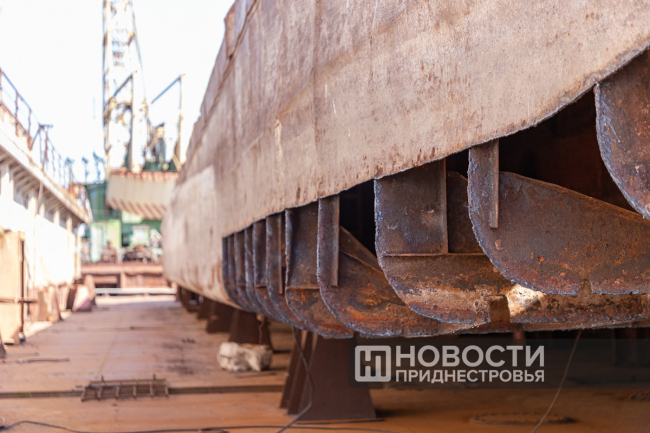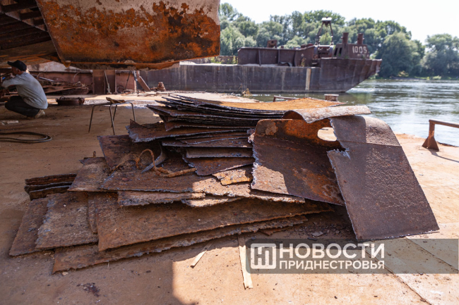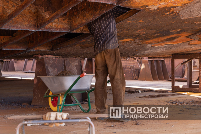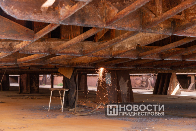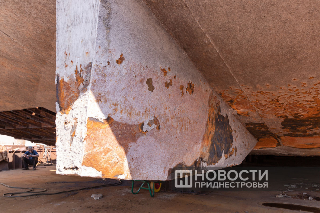 «В основном её эксплуатировали на лимане, баржа получила повреждение и износ корпуса. Вот видно раковины, они изношены, подлежат замене. Но есть даже дырочки, маленькие, как сито. Это говорит о том, что днище изношено, оно набирает воды, и баржа тонет. Верхняя часть наиболее исправна и годна к эксплуатации. Решили восстановить её, поставить в док, заменить днище и скуловые подвороты», – рассказал директор Бендерского речного порта Александр Брынзан.