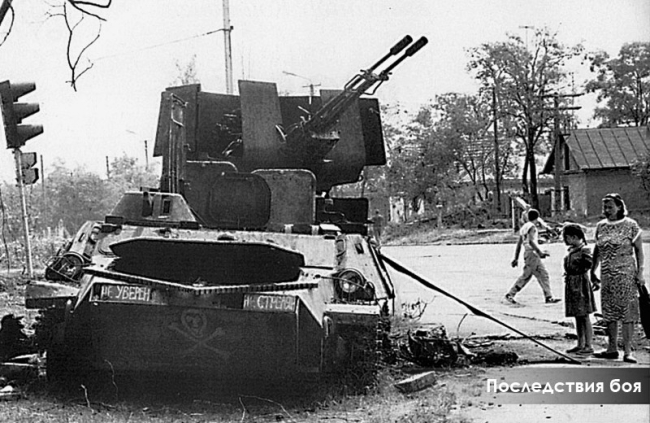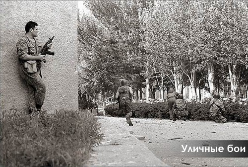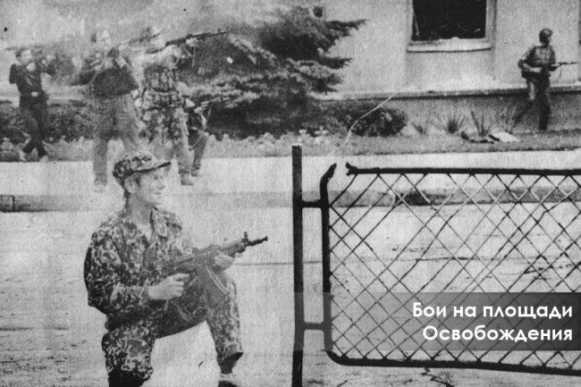 Константин М., командир подразделения ТСО (из книги Г. Волового): «К восьми вечера стало известно, что по улице Коммунистической в нашу сторону движутся два бронетранспортера с десантом и боевая машина пехоты (БМП). Мы срочно приготовили специальные мины МОН-100 и привязали их к деревьям в парке имени Горького. Когда БТРы с десантом проходили мимо, мины были взорваны. Взрывом и осколками десант смело с брони. После это нам пришлось отойти в район исполкома и рабочего комитета, где заняли оборону».