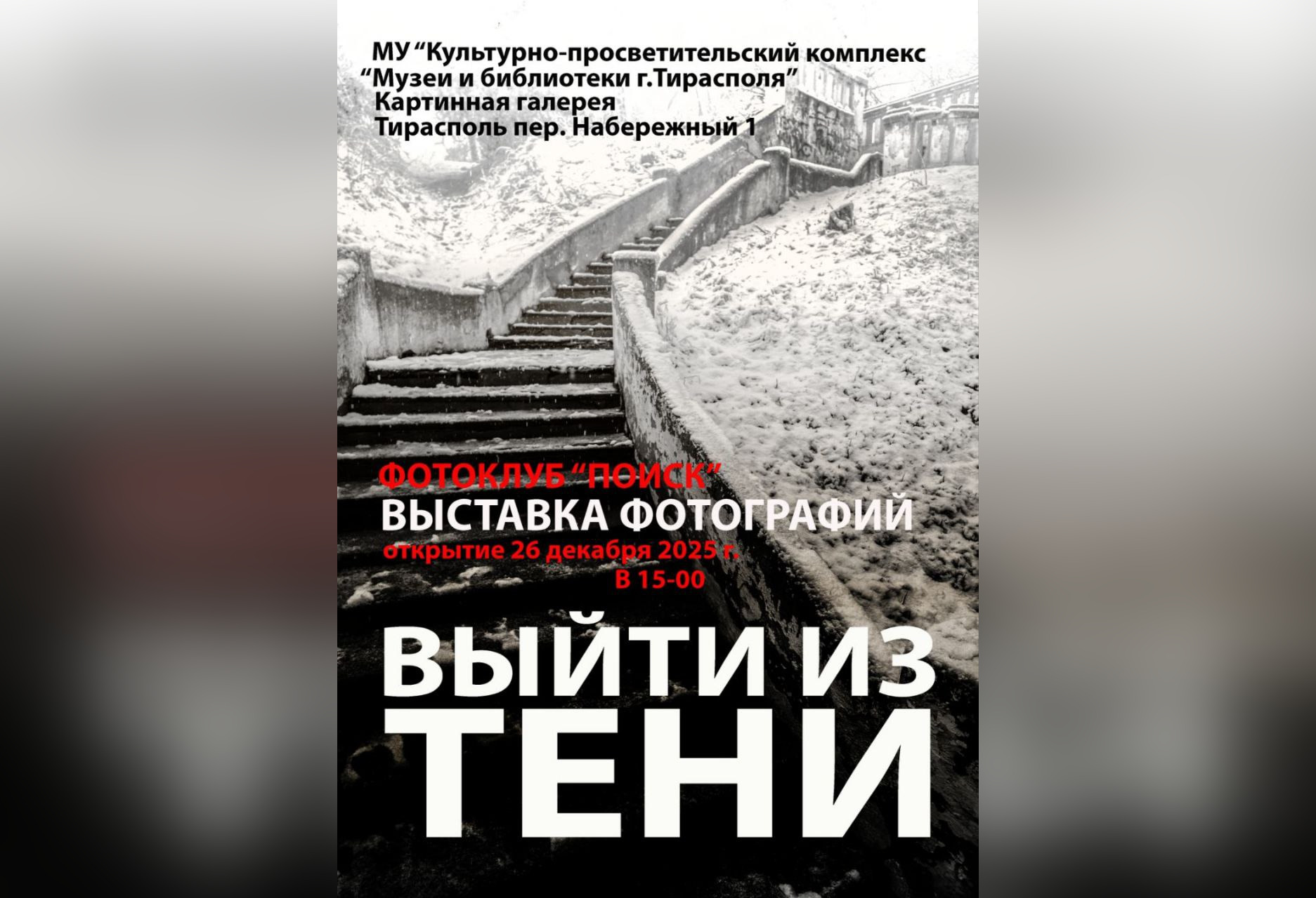 Тирасполь, 25 декабря. /Новости Приднестровья/. 26 декабря в 15 часов в Тираспольской картинной галерее (переулок Набережный, 1) откроется выставка «Выйти из тени», организованная фотоклубом «Поиск» — одним из старейших творческих объединений города, работающим с 1978 года.