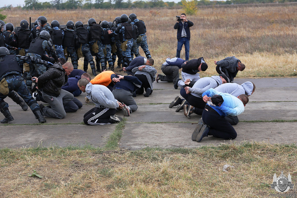 На завершающем этапе бойцы СМВЧ отработали построение «черепаха», применяемое для безопасного подхода к зданию, в котором забаррикадировались «зачинщики беспорядков». Пока две шеренги правоохранителей, накрывшись щитами, держали оборонительные порядки, внутрь строения вошла группа изъятия и через время вывела агрессивных «фанатов».