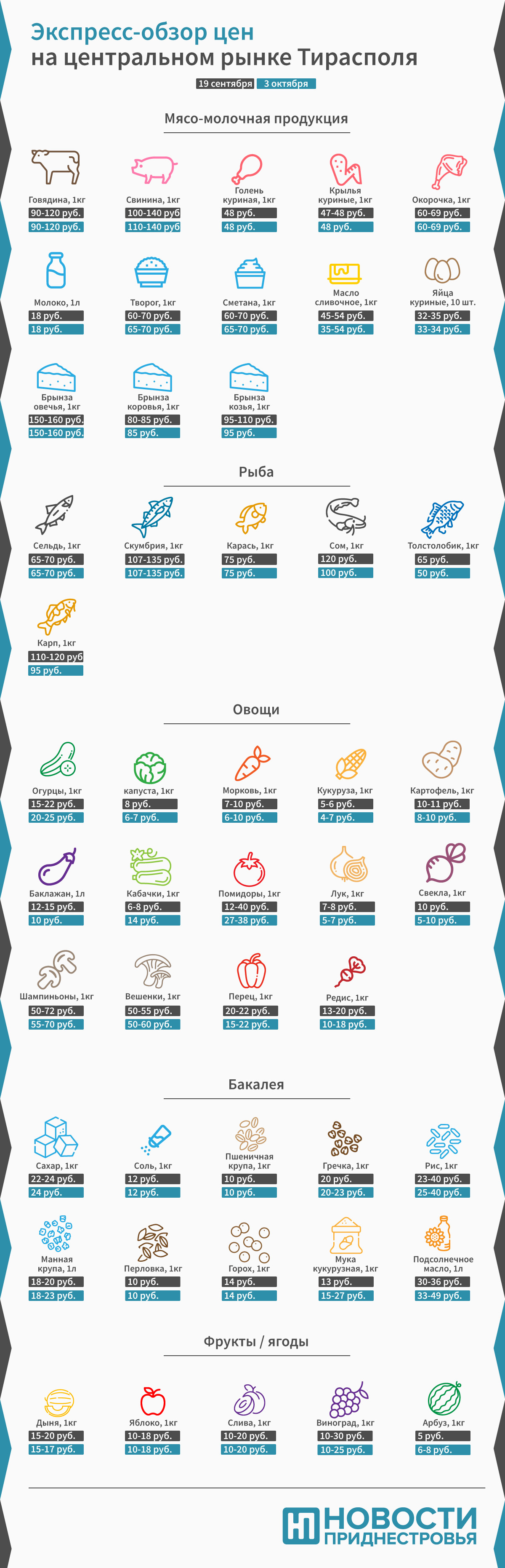 Тирасполь, 3 октября. /Новости Приднестровья/. Сегодня на Зелёном рынке Тирасполя побывал корреспондент «Новостей Приднестровья», чтобы узнать, как изменились цены на различные продукты питания за минувшие две недели.