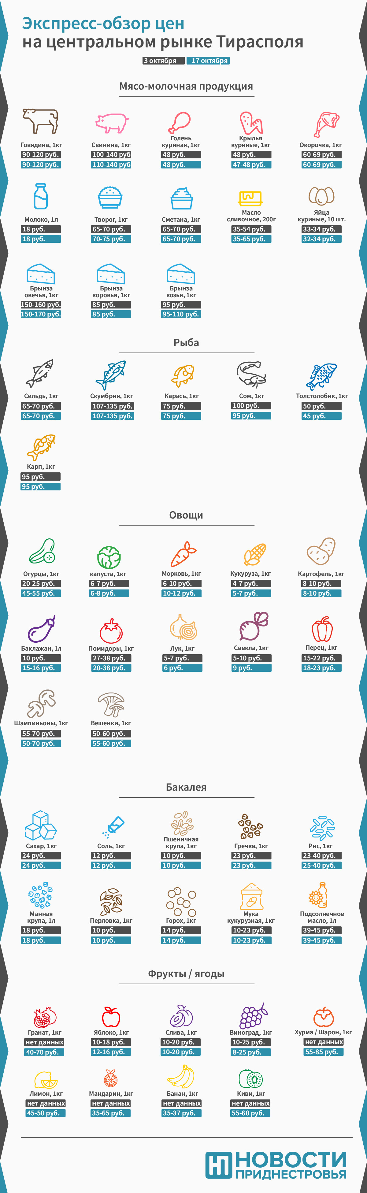 Тирасполь, 17 октября. /Новости Приднестровья/. Сегодня на Зелёном рынке Тирасполя побывал корреспондент «Новостей Приднестровья», чтобы узнать, как изменились цены на различные продукты питания за минувшие две недели.