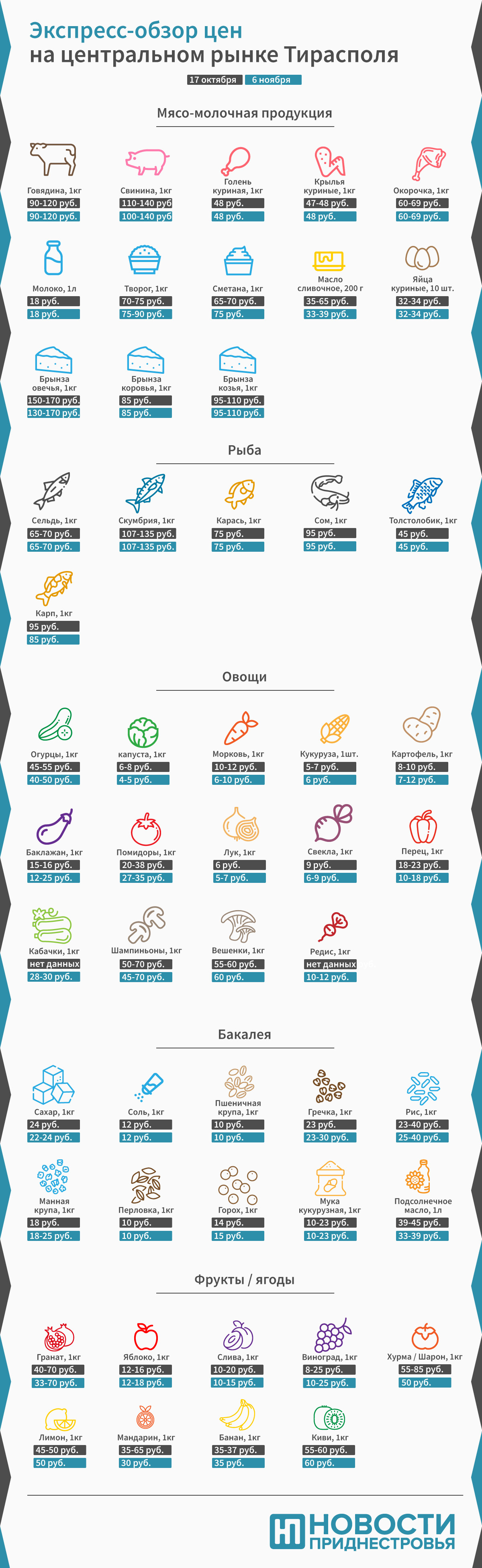 Тирасполь, 6 ноября. /Новости Приднестровья/. Сегодня на Зелёном рынке Тирасполя побывал корреспондент «Новостей Приднестровья», чтобы узнать, как изменились цены на различные продукты питания за минувшие три недели.