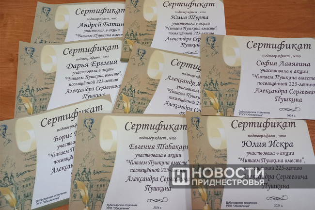 На память о флешмобе всем его участникам вручили сертификаты участника акции «Читаем Пушкина вместе».