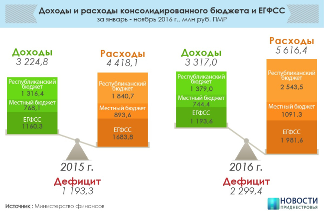 Всего же за 11 месяцев дефицит консолидированного бюджета и ЕГФСС заметно увеличился по сравнению с аналогичным периодом прошлого года. За январь-ноябрь 2016 года он составил 2,2 миллиарда рублей, тогда как за 11 месяцев 2015 дефицит равнялся 1,1 миллиарда рублей.