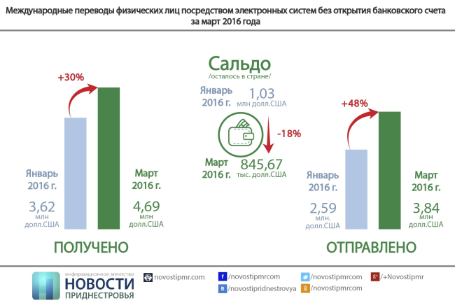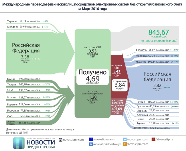 При этом сумма денежных переводов, отправленных гражданами из Приднестровья в другие страны в марте, составила 3,84 млн долларов (в январе - 2,59 млн). Большая часть из этой суммы была отправлена в РФ.