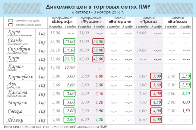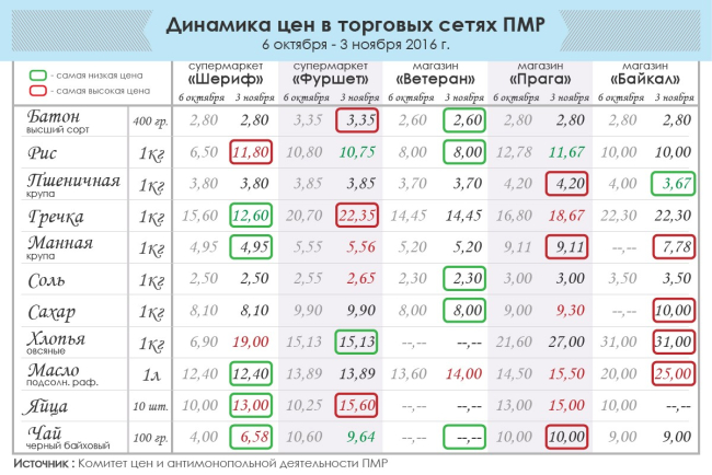Также начало ноября ознаменовалось подорожанием овощей. В «Фуршете» стали продаваться по более высокой цене картофель (+20 коп.), капуста (+20 коп.) и морковь (+30 коп.), в рыбницком «Байкале» подорожали морковь (+10 коп.) и свекла (+20 коп.). Кроме того в «Праге» выросли в цене подсолнечное масло (+1 руб.), куриные яйца (+2 руб.), сахар (+30 коп.) и гречневая крупа (+1 руб. 67 коп). А вот в «Шерифе» гречка напротив подешевела (- 3 руб.), но зато рис подорожал почти вдвое с 6 руб. 50 коп. до 11,8 коп. за 1 кг.