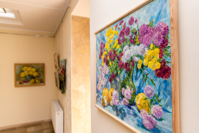 Позитивные эмоции, кроме пейзажей с Днестром, дарят и натюрморты. Говоря о цветочных композициях, Оксана Пономаренко отметила, что такие картины – неотъемлемая часть творчества любой художницы. Данное явление она связывает с тонкостью женской души. Одна из самых ярких работ на выставке – композиция из ирисов.