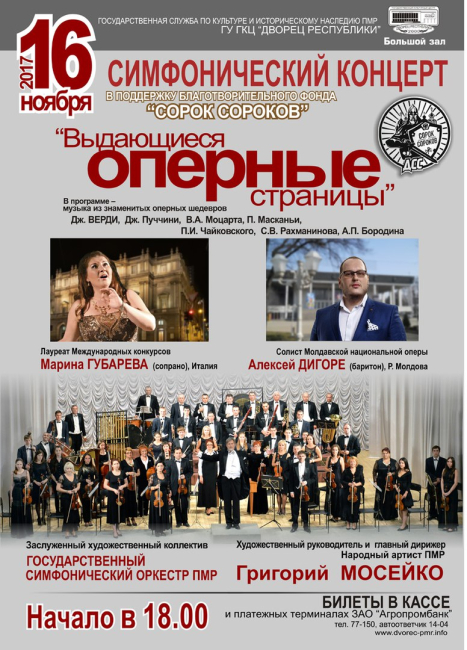 Тирасполь, 13 ноября. /Новости Приднестровья/. В четверг, 16 ноября, в большом зале Дворца Республики состоится совместный концерт Государственного симфонического оркестра ПМР и итальянской оперной певицы Марины Губаревой, а также солиста Молдавской национальной оперы Алексея Дигоре.