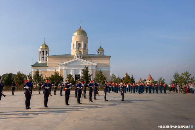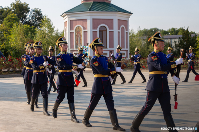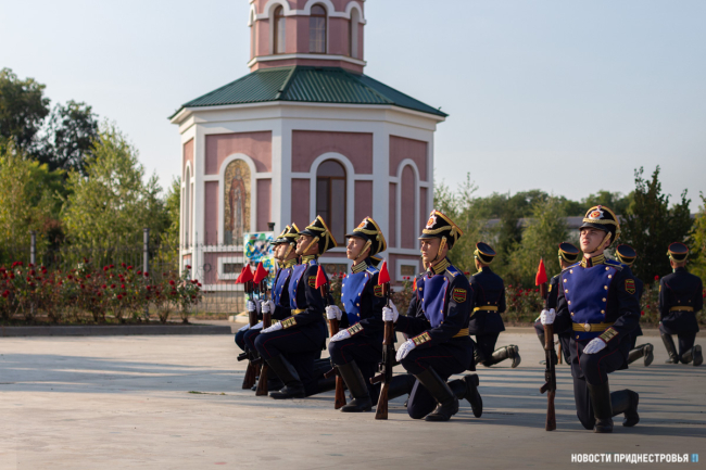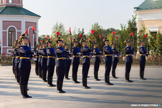 Праздничные мероприятия продолжились на плацу Александро-Невского парка. Здесь под аккомпанемент оркестра Главного штаба Министерства обороны ПМР своё мастерство продемонстрировали военнослужащие Роты почётного караула.