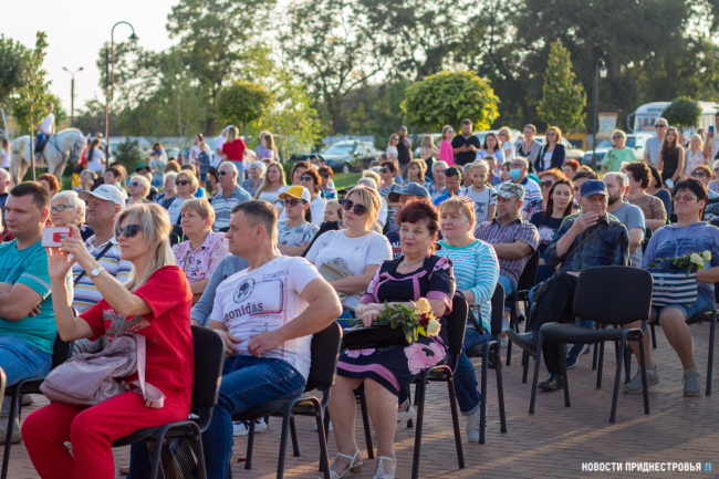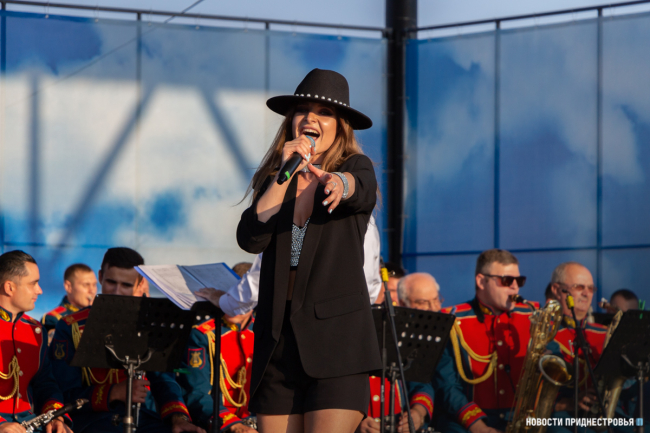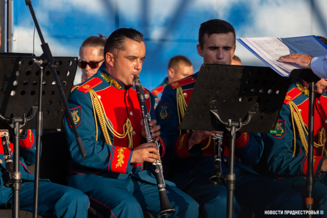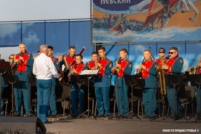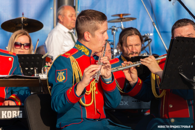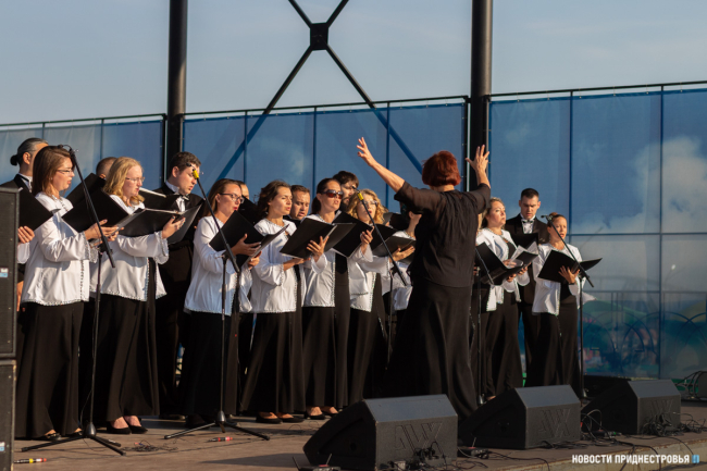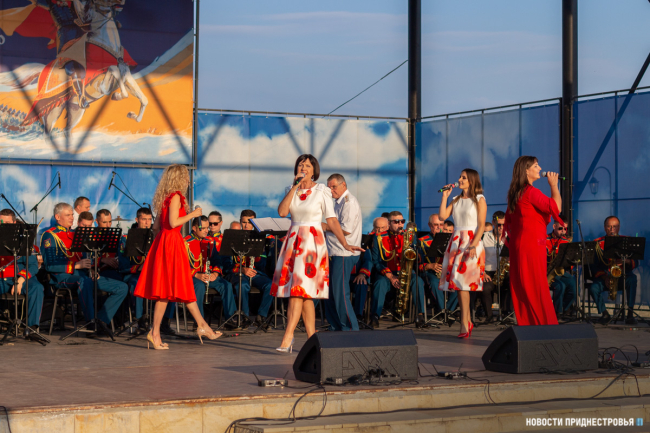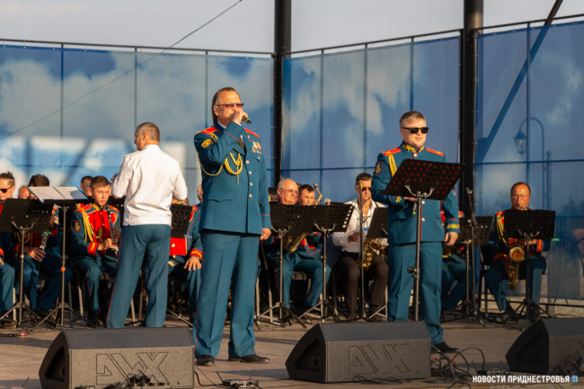 После на сцене парка начался большой музыкальный концерт. Перед бендерчанами и гостями праздника выступили Приднестровский государственный хор и оркестр Главного штаба Вооруженных сил ПМР под управлением Виталия Войнова.