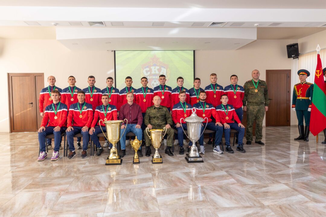 Футболистам вручили медали, благодарственные письма, кубок за первое место в чемпионате ПМР и памятные подарки, сообщает пресс-служба Минобороны.