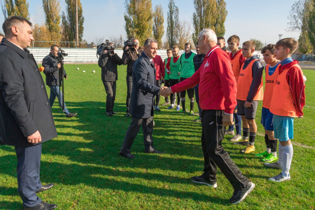 Рыбница, 1 ноября. /Новости Приднестровья/. Находясь с рабочим визитом на севере республики, Президент ПМР Вадим Красносельский побывал на городском стадионе Рыбницы, который входит в состав спорткомплекса «Юбилейный», сообщает президентская пресс-служба. В эксплуатацию стадион был сдан в 1975 году и вмещает 5 тысяч человек. Глава государства сегодня пообщался с футболистами местной команды «Искра», которая является чемпионом Приднестровья.