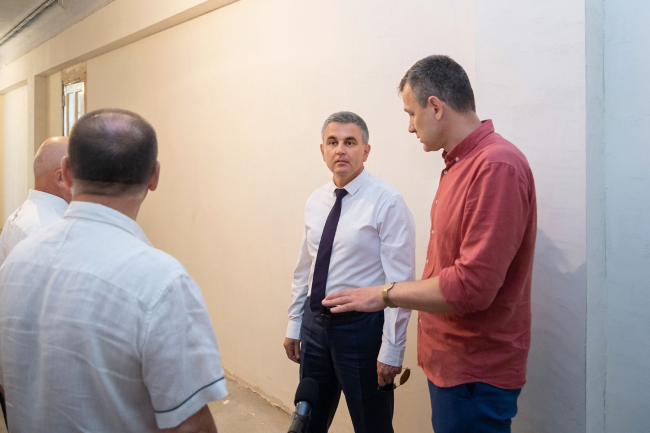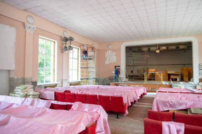Здесь идут общестроительные работы в актовом зале, на сцене и помещениях второго этажа. Из Фонда капвложений выделен миллион, сообщает президентская пресс-служба. На выходе из здания глава государства обратил внимание на съезд: угол наклона пандуса делает его неиспользуемым.