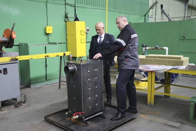 Владимир Трандасир также показал Сергею Оболонику опытный образец бытовых твердотопливных котлов, которые будут изготавливать на продажу для населения. Их мощность составит от 5 до 50 кВт.