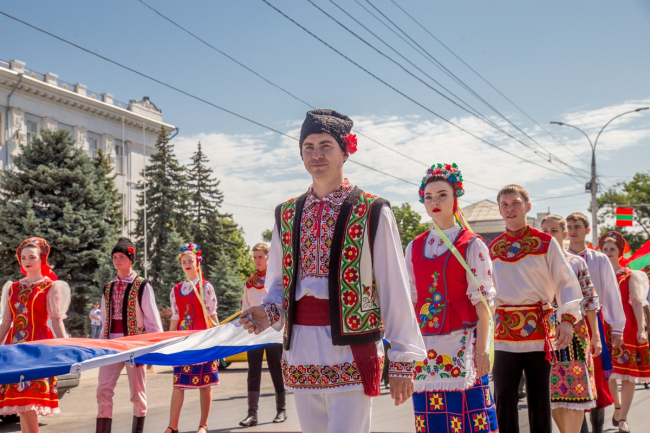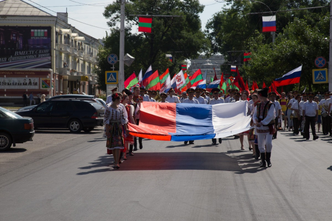 Марш-шествие «Россия в моем сердце» возглавили артисты Приднестровского государственного ансамбля танца и народной музыки «Виорика». В национальных костюмах – русском, молдавском и украинском - они пронесли Государственный флаг Российской Федерации. Вслед за ними с триколорами в руках прошли представители национальных общин, образовательных учреждений и предприятий города, государственные и муниципальные творческие коллективы, делегаты органов госвласти.