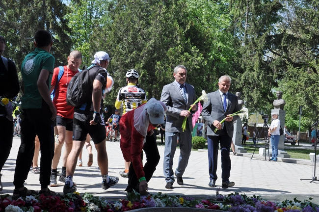 Продолжились мероприятия на мемориальном комплексе «Скорбящая мать», куда приехали участники первого международного велопробега «Знамя Победы».