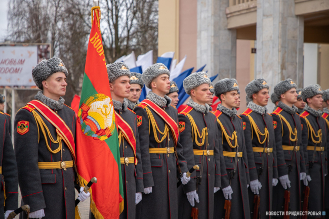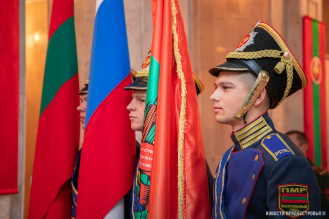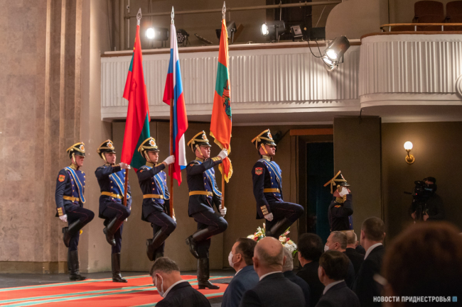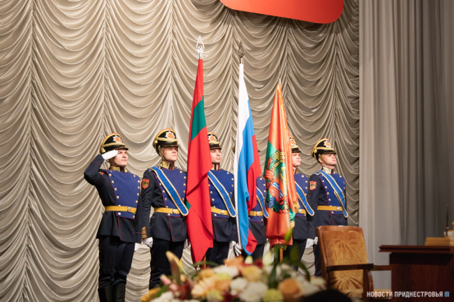 Под марш Преображенского полка военнослужащие роты Почётного караула вносят в зал символы президентской власти: флаг Приднестровской Молдавской Республики, а также штандарт Президента ПМР. Вместе с ними и флаг Российской Федерации.