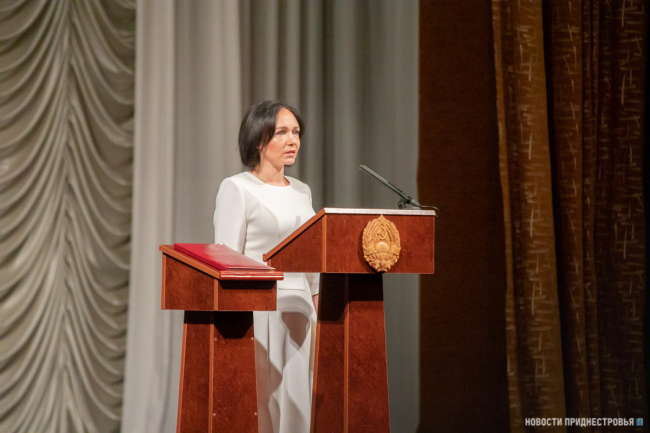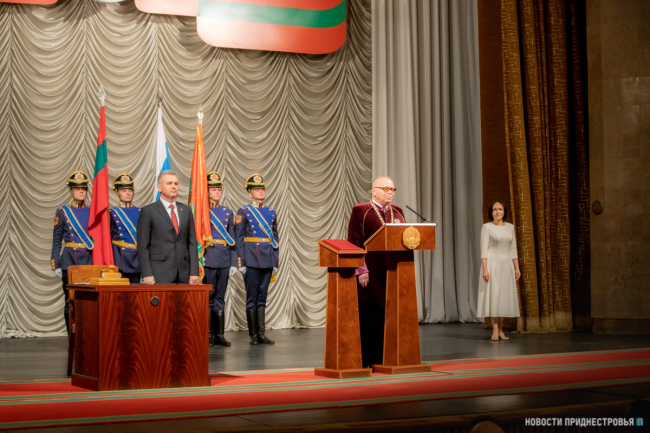 «Клянусь при осуществлении полномочий Президента Приднестровской Молдавской Республики уважать и охранять права и свободы человека и гражданина, соблюдать и защищать Конституцию Приднестровской Молдавской Республики и законы Приднестровской Молдавской Республики, защищать суверенитет и независимость, безопасность и целостность государства, верно служить народу Приднестровской Молдавской Республики», - произносит присягу Президент ПМР.