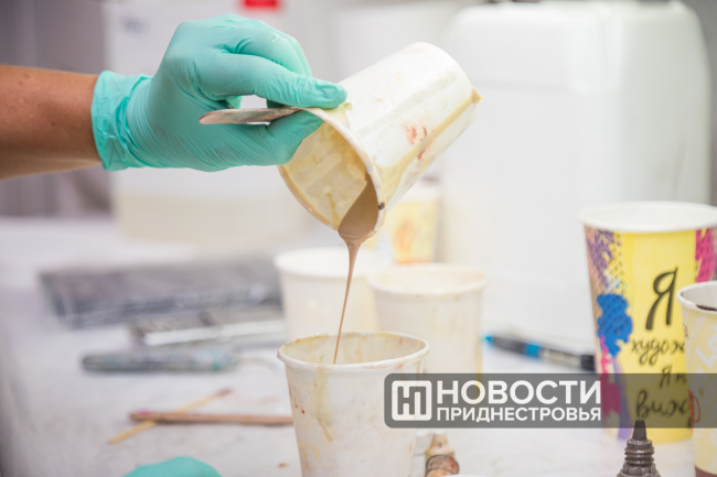 Во время общения с журналистами Ирина берется за очередной заказ. Для начала замешивает все необходимые компоненты, соединяя тягучую, как свежий мед, смолу с красителями. Потом начинается самая важная часть процесса – нанесение смолы разных оттенков на белую заготовку (артборд). Каким будет результат, зависит от особого видения и настроения мастера. В этот медитативный момент Ирина отключается от посторонних мыслей. На время все разговоры в мастерской затихают. Ирину никто не отвлекает.