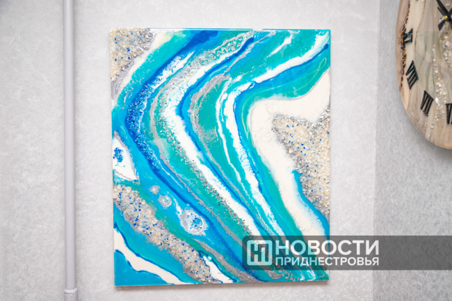 Опыты с эпоксидкой для Ирины остались в прошлом, но, похоже, настоящие эксперименты только начинаются. Приднестровская смолянистка выходит на новый уровень мастерства – изготовление больших изделий. Одна из последних работ – картина, совмещенная с часами, размером 110 на 85 см.