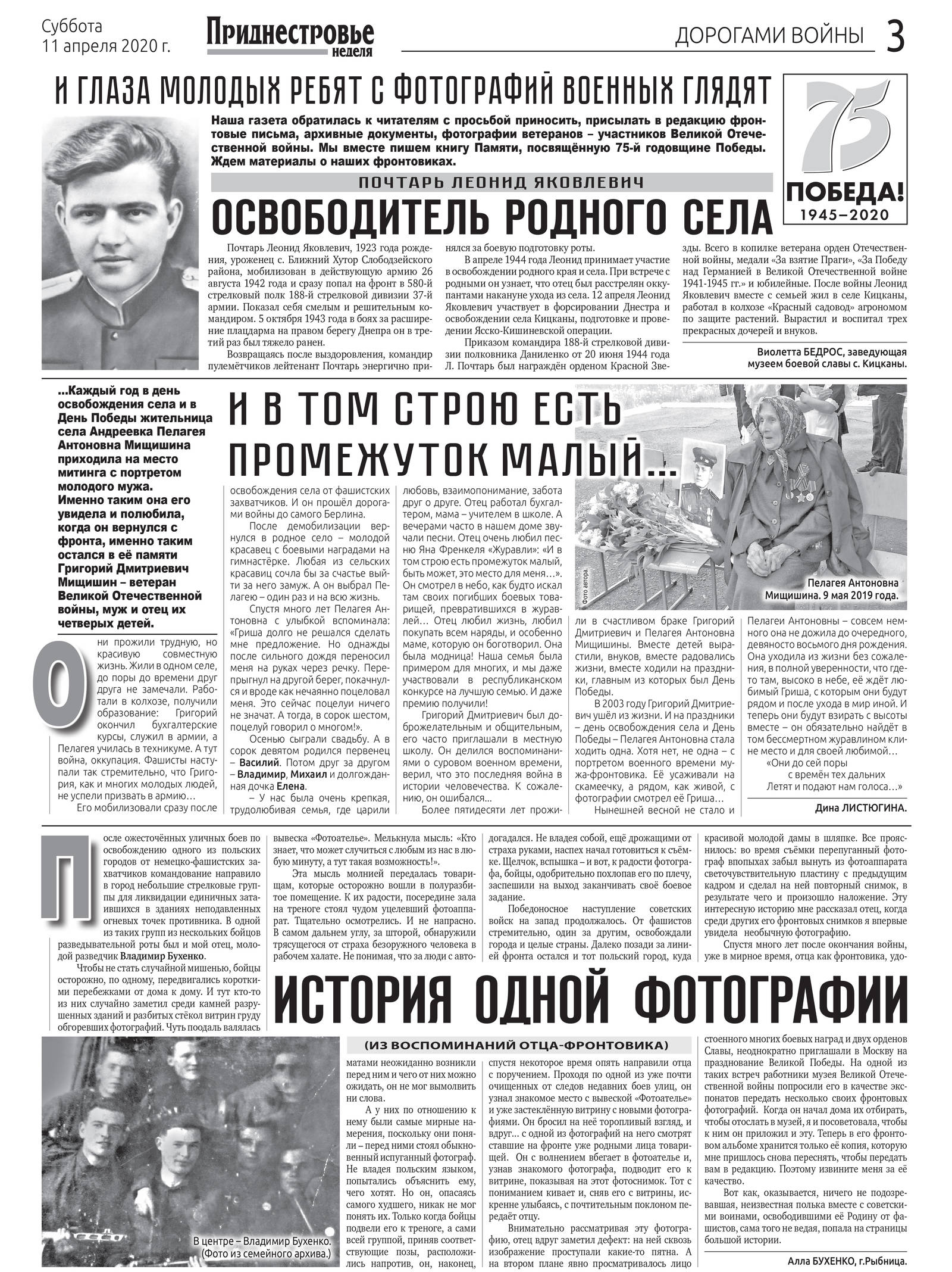 В субботнем номере газеты три материала этой рубрики: о лейтенанте Леониде Почтаре, которому в апреле 1944 года довелось освобождать своё родное село Кицканы; воспоминания жительницы села Андреевка Пелагеи Мещишиной о своём муже Григории, дошедшем в 1945 году до Берлина, и рассказ рыбничанки Аллы Бухенко «История одной фотографии». В нём повествуется о том, как группа разведчиков, в которой был и её отец Владимир Бухенко, во время боёв на улицах одного из освобождённых городов натолкнулась на фотоателье, где застали растерянного фотографа и решили сделать фотографию на память. Разведчику спустя некоторое время снова пришлось побывать в этом же городе, а в витрине ателье было выставлено то самое фото…