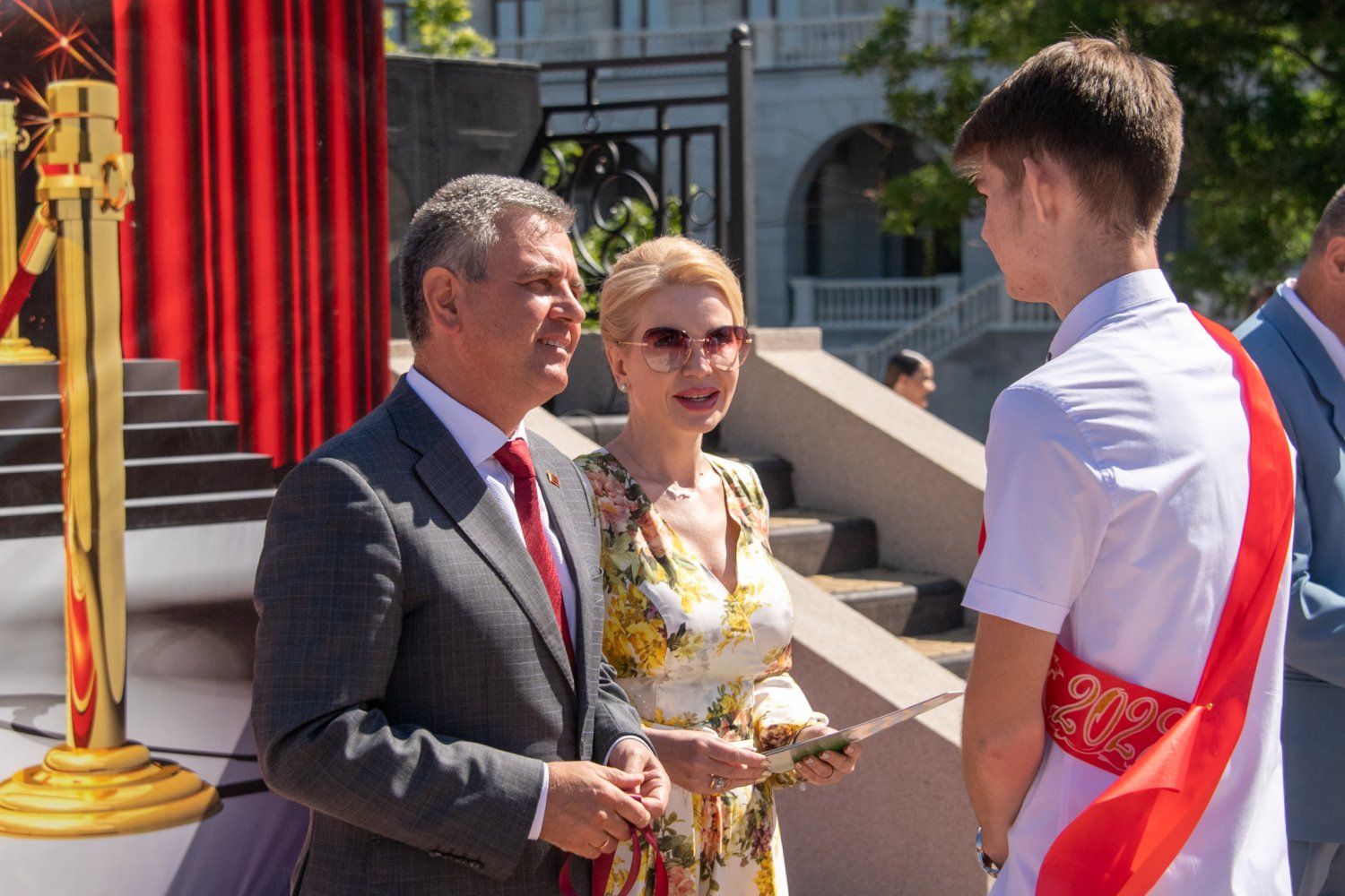 Вадим Красносельский с супругой Светланой поздравили лучших выпускников и вручили награды столичным медалистам. Особые слова признательности глава государства адресовал учителям и родителям ребят.