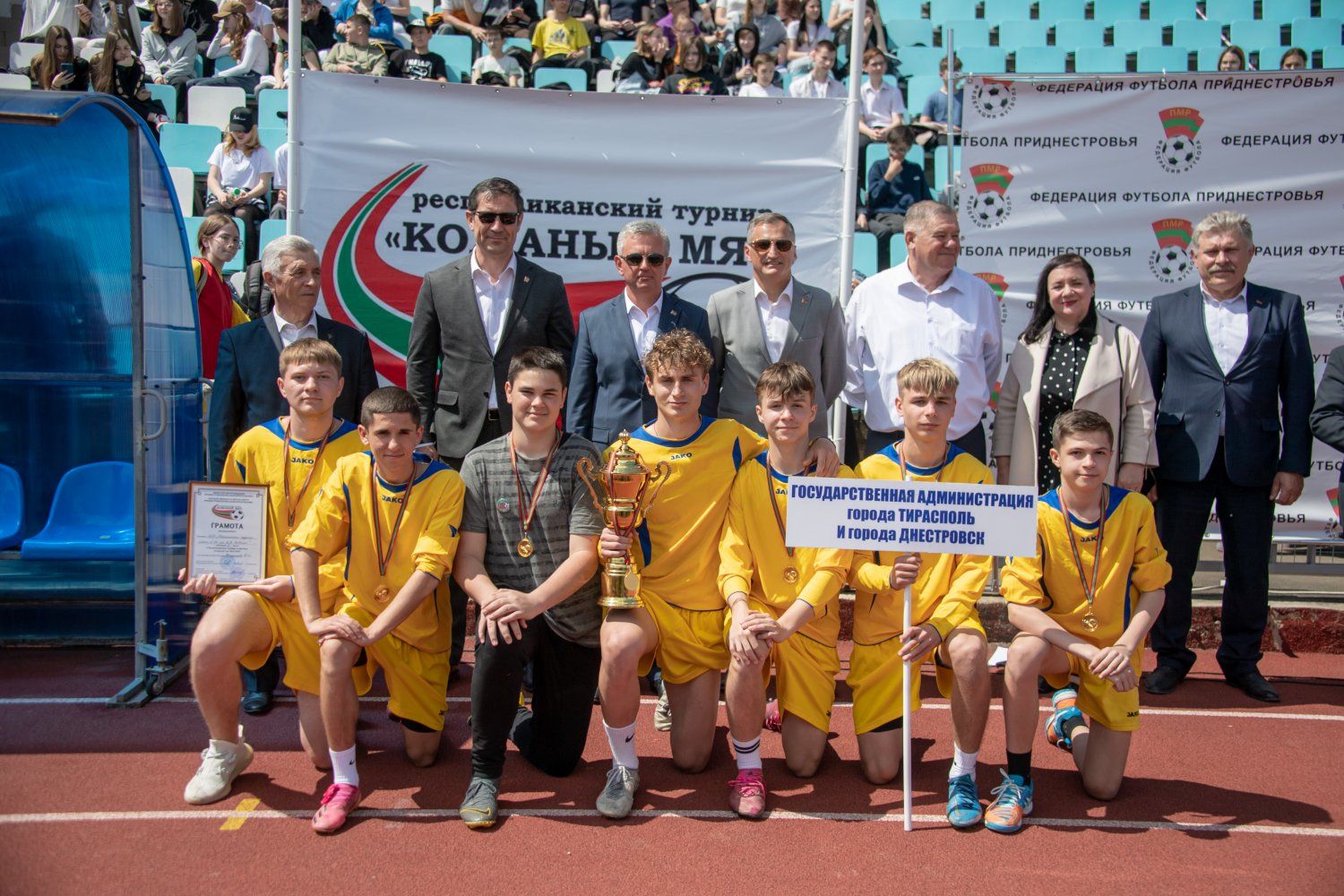 Подведены итоги республиканского турнира по футболу среди школьников «Кожаный мяч». Всего было 4,5 тысячи участников – это 460 команд, 47 из которых вышли в финал, а 18 стали победителями и призёрами в своих группах. Награды юным футболистам вручал 5 мая Президент Вадим Красносельский.