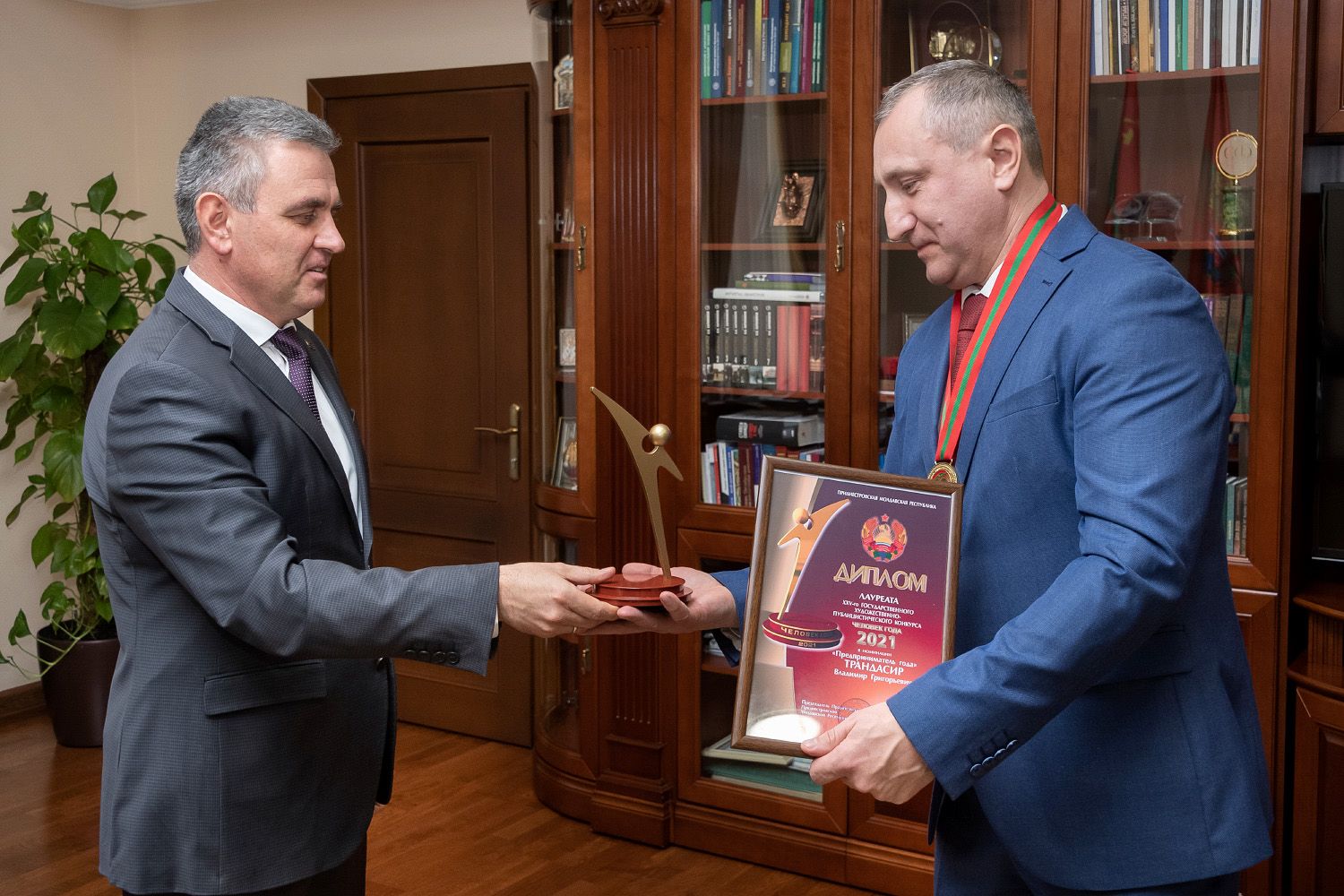 Состоялась церемония чествования победителей конкурса «Человек года – 2021». Награды вручили лучшим из лучших: работникам приднестровских учреждений и предприятий, представителям общественных организаций, союзов, движений – всего 19 гражданам республики. Лучшим предпринимателем 2021 года стал гендиректор завода «Электромаш». Награду Владимиру Трандасиру вручил Президент. Вадим Красносельский также выступил с обращением к лауреатам конкурса.