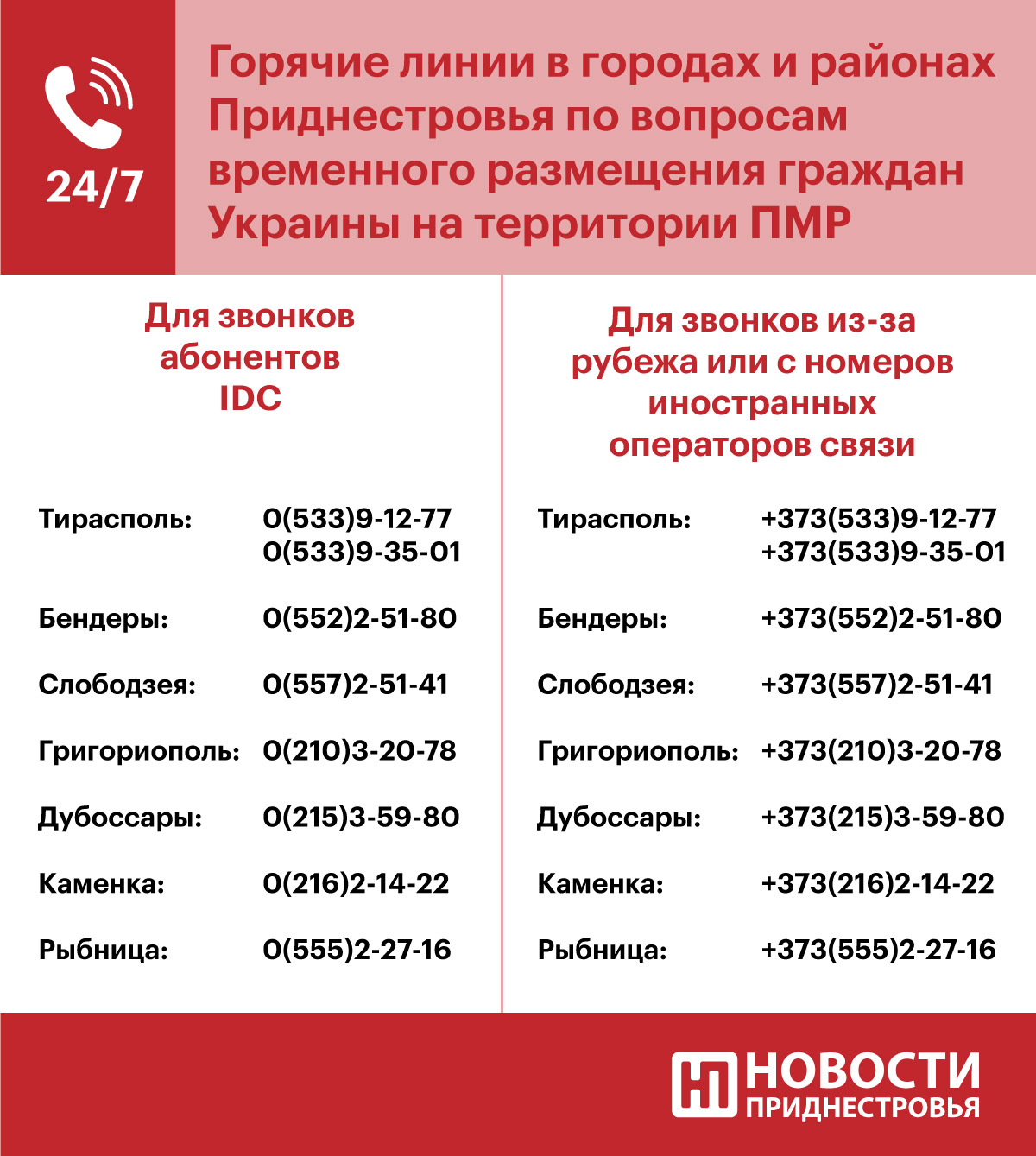Оперштаб открыл горячую линию по вопросам временного размещения иностранных граждан из Украины на территории Приднестровья. Она начала работу днём 24 февраля. Каждый, кто нуждается в помощи, может позвонить по единому номеру 0 (533) 9-12-77 либо + 373 (533) 9-12-77.