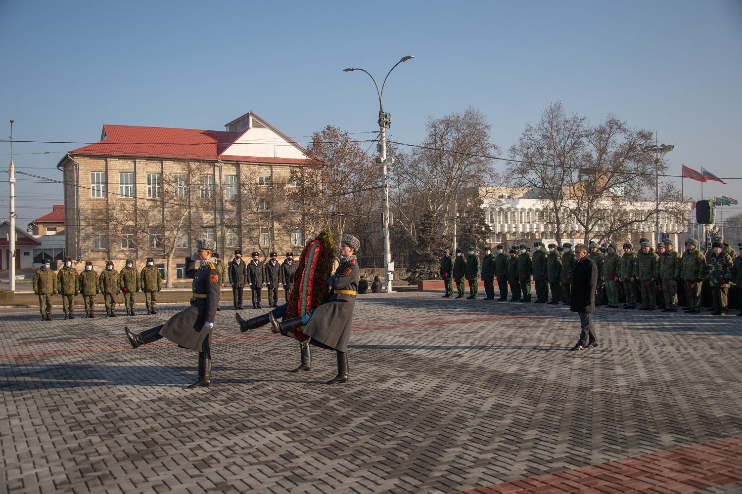 Глава государства 23 февраля возложил цветы к Вечному огню и могилам защитников. По завершении церемонии Президент поздравил солдат, офицеров и всех, кто стоит на страже мира и в любой момент готов защитить приднестровский народ.