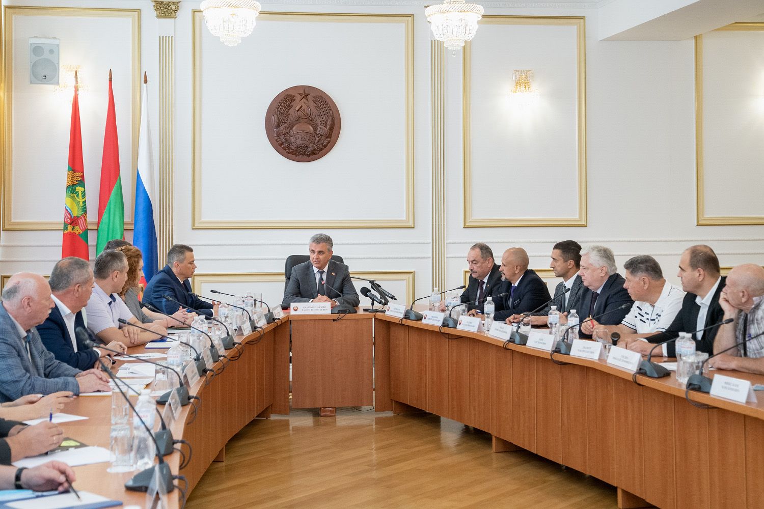 Глава государства провёл встречу с руководством и представителями Союза промышленников, аграриев и предпринимателей Приднестровья. Обсуждались вопросы, связанные со строительной и с дорожной отраслями, АПК, кадровым дефицитом. Бизнесмены подняли проблему нейтральных номеров и международных платежей из-за банковской блокады со стороны РМ. Говорили также о необходимости законодательного закрепления сроков проведения тендеров по объектам ФКВ, сохранении на прежнем уровне коммунальных тарифов для населения в 2022 году.