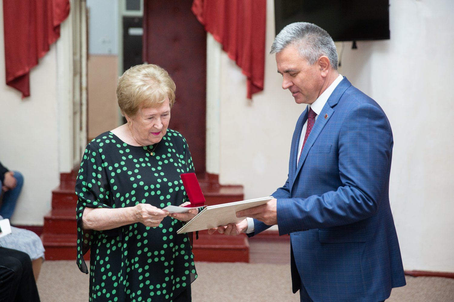 Глава государства поздравил с юбилеем преподавателя музыкально-теоретических дисциплин Ольгу Жуковскую. Вадим Красносельский вручил педагогу удостоверение и нагрудный знак «Заслуженный работник ПМР».